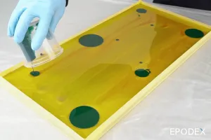 - أضف الملوّن المعدني المزوَّد YELLOW GOLD إلى خليط الراتنج/المصلب. نوصي بنسبة لون تقريباً 1.5%، على سبيل المثال 15g صبغة لكل 1kg راتنج + مصلب.