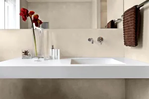 الميكروسمنت EPODEX بالاشتراك مع مانع التسرب من راتنج البولي يوريثان (PU) مقاوم للماء ومقاوم للعوامل الجوية. لذلك فهو مثالي للحمامات والمناطق الخارجية. تُدحرج طبقة العزل في النهاية على الميكروسمنت المتصلب. وفقًا لمتطلباتك، يمكنك الاختيار بين مانع التسرب من PU المطفي أو اللامع.