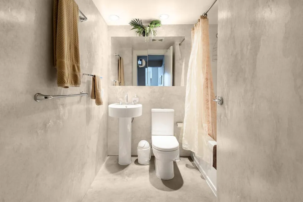 ميكروسيمنت EPODEX، عند دمجه مع مانع التسرب المصنوع من راتنج البولي يوريثان (PU) الخاص بنا، يكون مقاومًا للماء ومقاومًا للعوامل الجوية. لذلك فهو مثالي للدشّات والمناطق الخارجية. تُدحرج طبقة الختم أخيرًا فوق الميكروسيمنت المتصلب. اعتمادًا على متطلباتك، يمكنك الاختيار بين مانع التسرب PU المطفي أو اللامع.